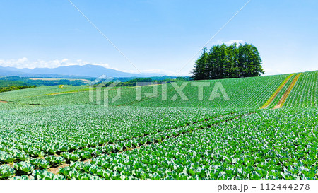快晴の青空をバックにキャベツ畑が咲いている風景を撮影