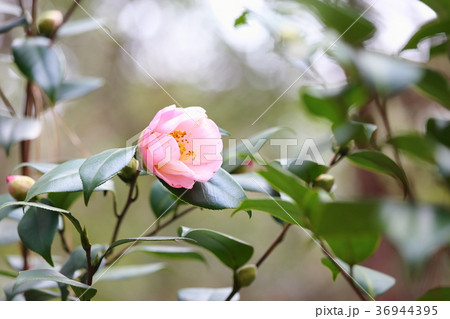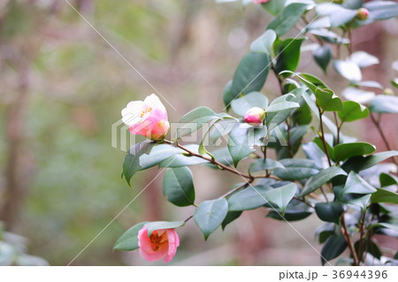 木陰に咲く桃色の椿の花 1月 モノクローム