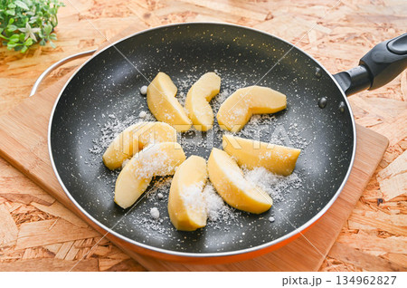 砂糖を振りかけたフライパンの中のりんご