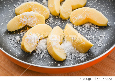 フライパンに並べた切った梨