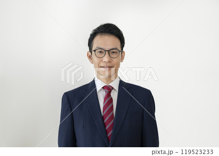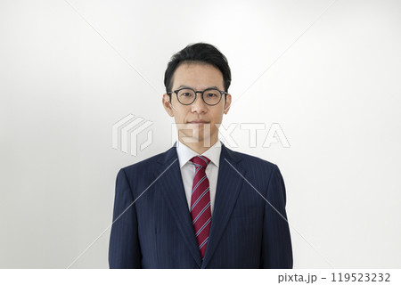 カメラ目線のメガネをかけた30代後半のビジネスマン
