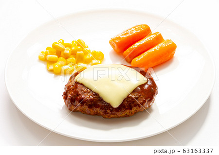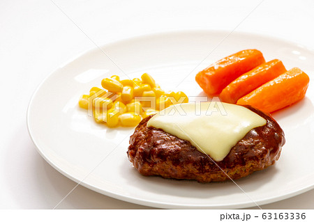 チーズハンバーグ・コーンとにんじんグラッセ添え。(白バック)
