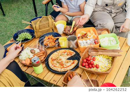 公園・キャンプ場でデイキャンプ・キャンプ・バーベキューを楽しむ仲良しのファミリー