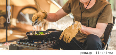 キャンプ場でスキレットを使ってアヒージョを作る男性キャンパー(キャンプ飯)