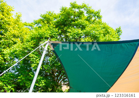Camping outdoors with lots of sunlight. tent, chairs, a tent BBQ rack, and more
