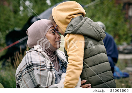 Happy middle-eastern mother in headscarf touching foreheads with daughter while finding her after escape from battlefield