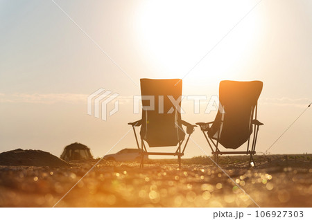Two empty camping chairs on the ground. An ideal place to watch sunset or sunrise. Active relaxing lifestyle