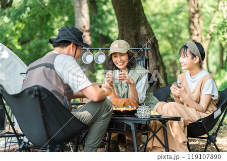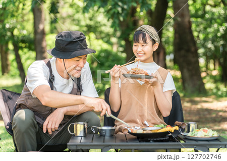 公園・キャンプ場でデイキャンプ・キャンプ・バーベキューを楽しむ仲良しの親子