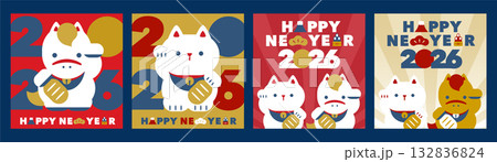 2026馬モチーフの招き猫が新年を祝う干支デザインのかわいい幾何学的な招きポーズ:イラストロゴ