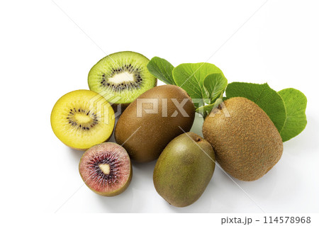 背景白の三種のキウイフルーツ_グリーン_ゴールド_ルビーレッド