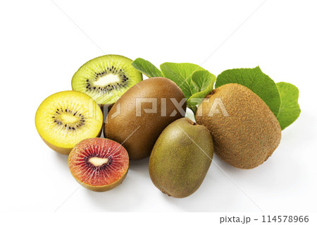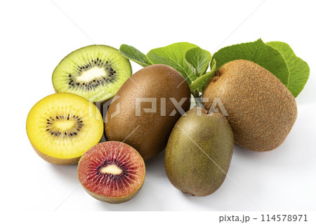 背景白の三種のキウイフルーツ_グリーン_ゴールド_ルビーレッド