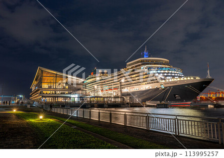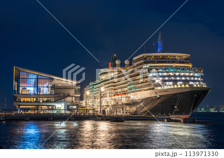 夜の東京国際クルーズターミナルに停泊する豪華客船クイーン・エリザベス