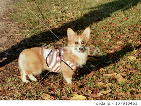 散歩を楽しむコーギー犬。