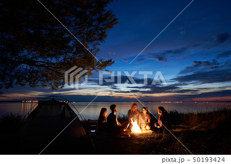 Night summer camping on shore. Group of young tourists around campfire near tent under evening sky