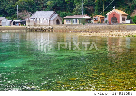 半泊教会と入り江のビーチ(長崎県福江島)