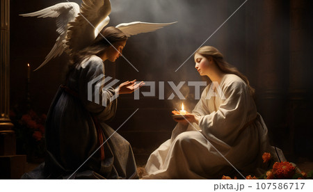 Tenebrist recreation of The Annunciation by the archangel Gabriel to Virgin Mary. Illustration AI