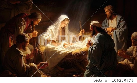 Nativity scene with Mary, Joseph, shepherds and angel around baby Jesus in a manger, Traditional Christmas depiction of the birth of Christ