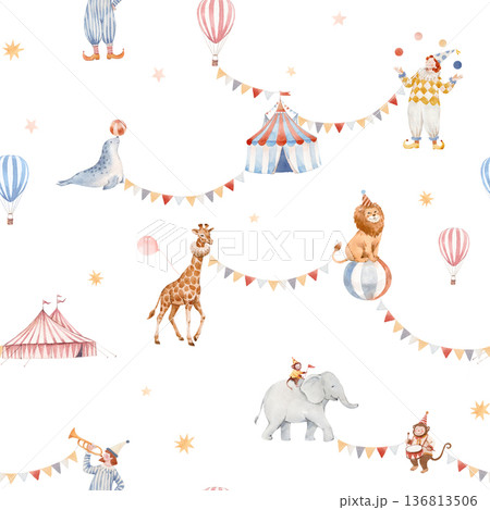 Seamless baby circus watercolor pattern with cute animals and performers. Vintage carnival background with elephant, giraffe, clowns, circus tent, balloons and stars. Perfect for nursery decor