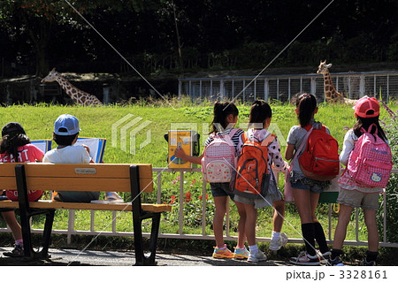 動物園で向かい合うダチョウとキリンのいる風景写真素材
