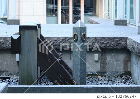 JR神戸駅に設置されている東海道本線と山陽本線の境界杭(縦構図)(神戸市中央区)