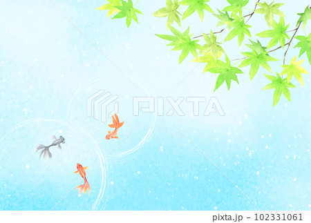 水彩で描いた青もみじと金魚の背景イラスト はがきサイズ比率
