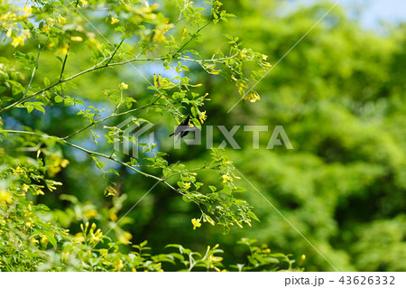 キンケイの黄色い花と若葉に新緑とクロアゲハ 小石川植物園