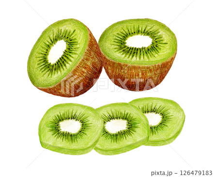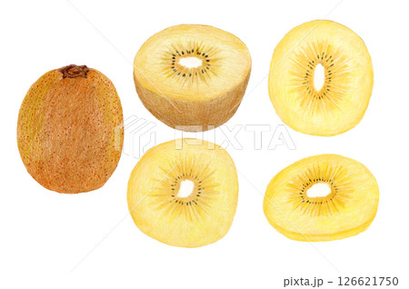サンゴールドキウイの輪切りとハーフカットを並べた色鉛筆画