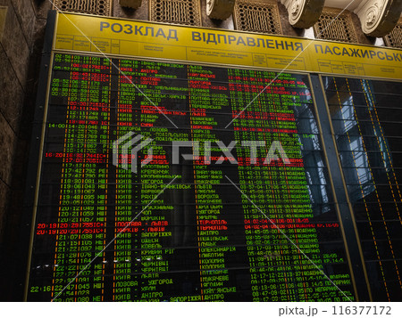 【ウクライナ】首都キーウ中央駅の列車の到着と発車時刻を表示した電光掲示板