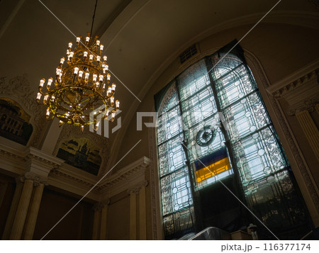 【ウクライナ】首都キーウ中央駅校内のシャンデリアと窓ガラスにウクライナ国旗が掲げられたインテリア