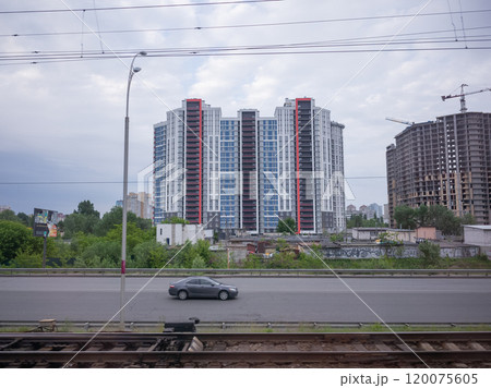 【ウクライナ】鉄道の車窓から望むモダンなビルが立ち並ぶ首都キーウの街並みと道路を走る自動車