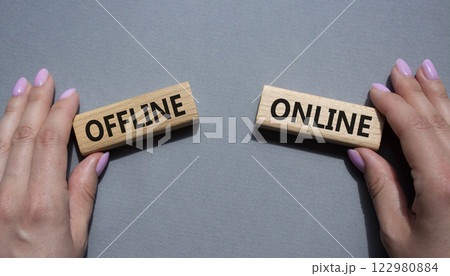 Offline or Online symbol. Concept word Offline or Online on wooden blocks. Businessman hand. Beautiful grey background. Business and Offline or Online concept. Copy space