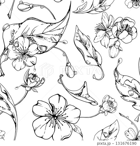 Cherry sakura apple white flower and bud with plant leaves on branches, hand drawn vector ink, wildflower botanical illustration. Seamless isolated pattern, for scrapbooking, wedding, florist shop.