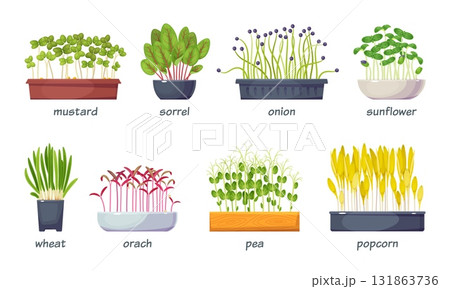 Cartoon microgreens. Different sprouted grains, sprouts of edible plants, healthy salad, vegetarian food, pea, mustard, onion and wheat. Seedling with leaves in pots classy vector isolated set
