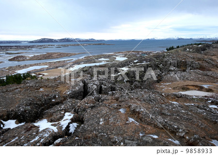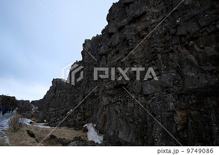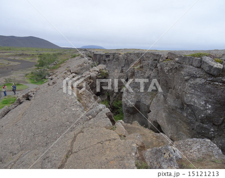 アイスランド・ゴールデンサークルのシンクヴェリトル国立公園にて大陸プレートの裂け目ギャオ