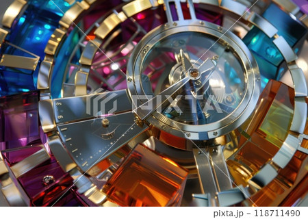 Close-up of the colorful clock mechanisms. Gears and levers in a clockwork movement