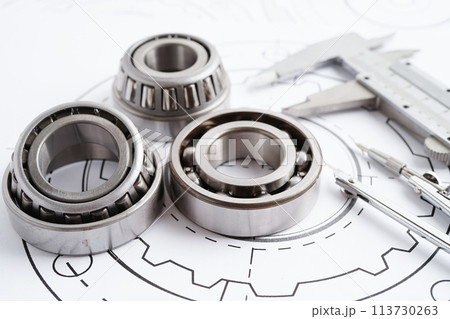 Engineering tools and mechanical industrial with vernier caliper and metal ball bering.
