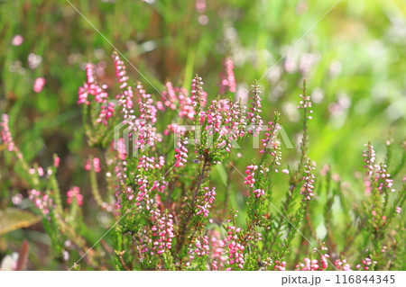 Blooming Calluna vulgaris, known as common heather, ling, or simply heather. Natural spring background with sun shining through pink beautiful flowers.