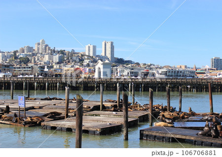 サンフランシスコの人気スポット、ハイド ストリート ピアからの風景。ギラデリの大きな看板が見える