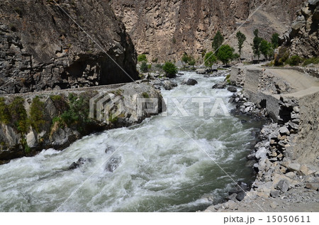 パキスタン ギルギット郊外の渓谷 険しい山と急流の川