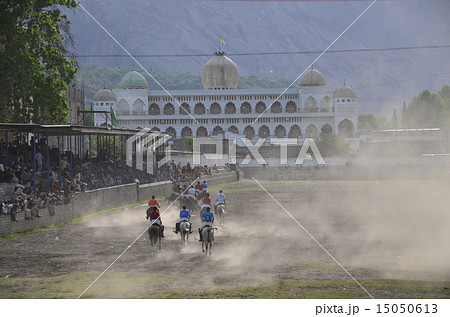 パキスタン ギルギットのポロ競技場とモスク ポロの試合と応援する観客