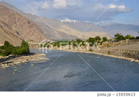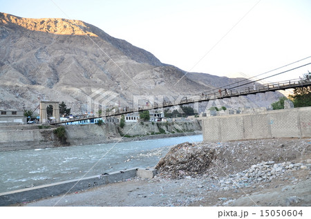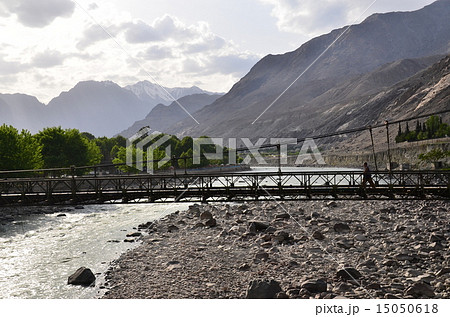 パキスタン ギルギットの美しい景色 ギルギット川と吊り橋