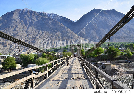 パキスタン ギルギット中心部 山とギルギット川 吊橋を渡るパキスタン人