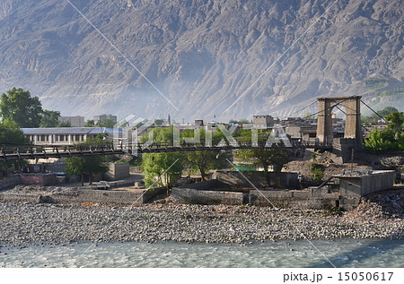 パキスタン ギルギットの街並み ギルギット川と吊橋