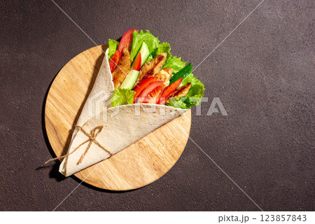 Grilled chicken wrap with fresh vegetables. Greek gyro wrap.