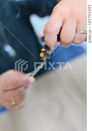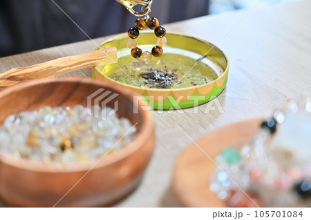 パロサント ホワイトセージでパワーストーンを浄化をする女性