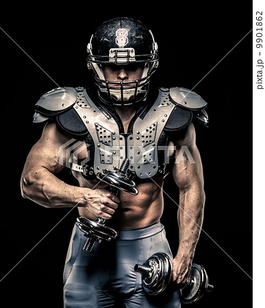 American football player with dumbbells wearing helmet and protective armour
