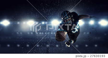 American football player in dark uniform with the ball is preparing to attack on a black background.