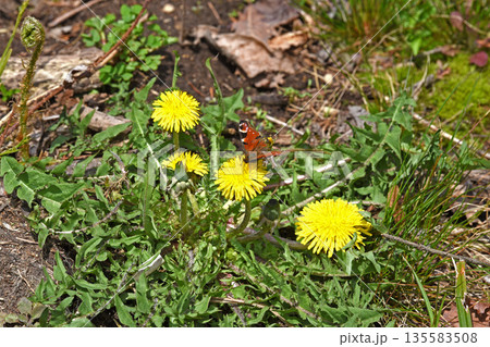 春の光を反射するタンポポにクジャクチョウが訪れている