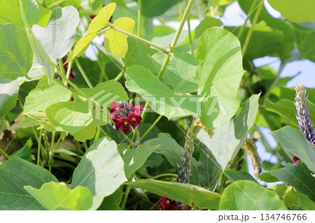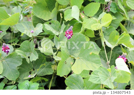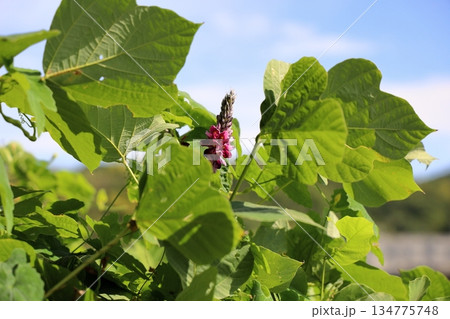 秋9月早朝の道端に咲く赤紫色のクズの花