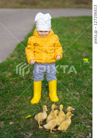 Cute baby girl with ducklings